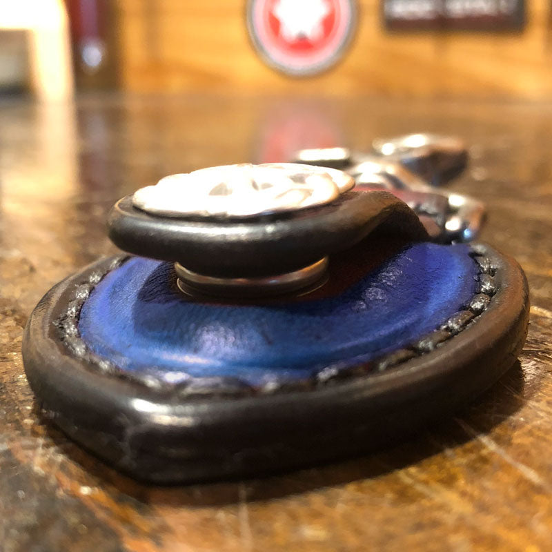 Handmade, blue stressed leather guitar pick case, with black stitching. Holds approximately ten picks. Shown with black stitching, Celtic snap and an easy to use, antique nickel trigger snap. Each leather guitar case is handmade from scratch, from high quality veg-tanned leather before being dyed, stitched and finished off with a snap and hardware of your choice. Select from a variety of themed and standard snaps and trigger snap finishes.