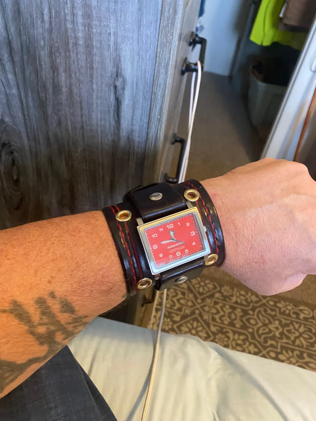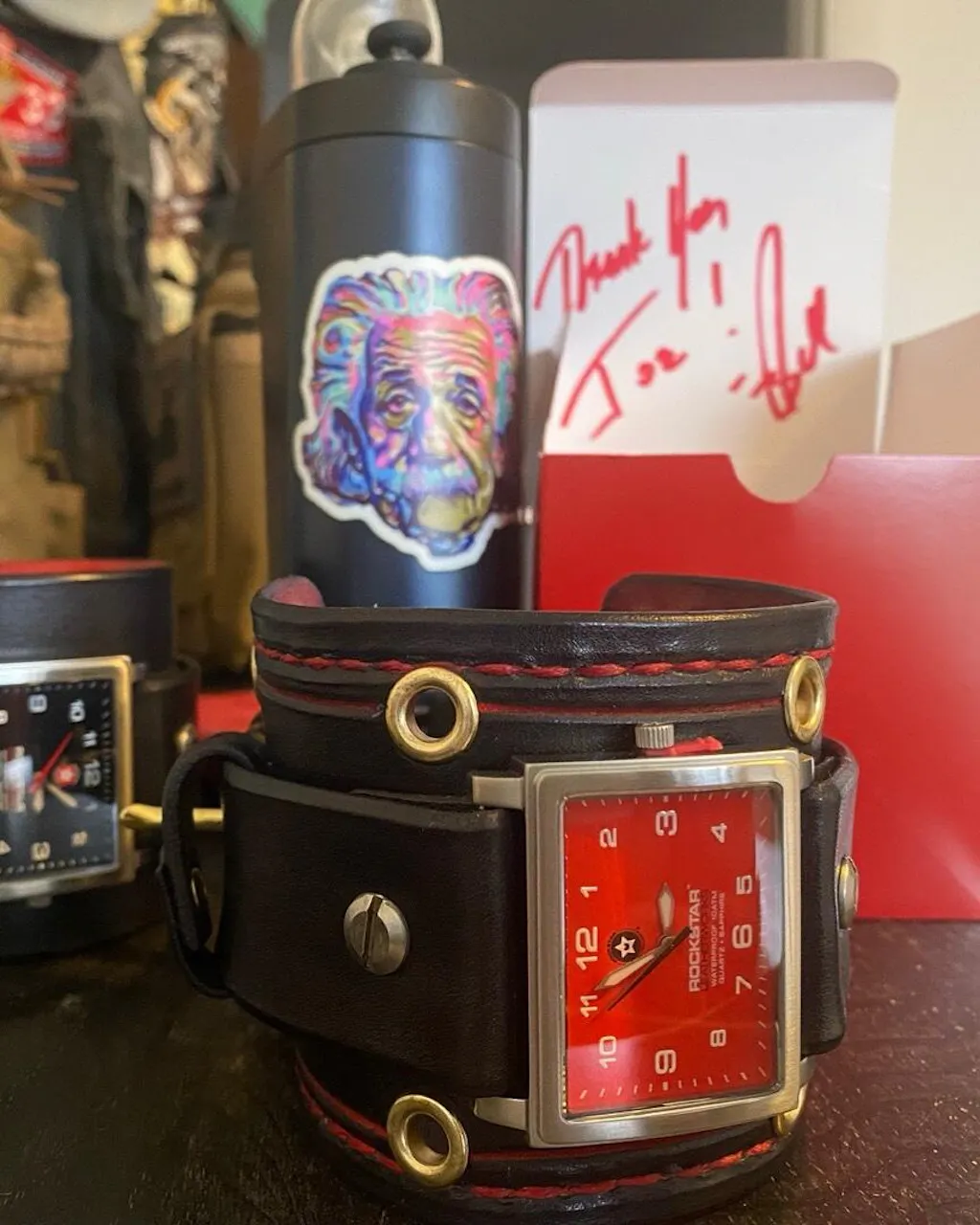 The watchband arrived and is amazing! You are a true artist of leatherworks! And I loved the packaging, the sticker which is already on my fridge, the small soft pouch and of course the watchband! And the fact that you signed the box personally with a special note to me was an additional touch of class. No one else out there that I’ve found does that anymore. Your workmanship, attention to detail and quality of the leather including the Bison snaps just topped it all off! Wow can’t say enough about it. I just wanted to let you know how happy I am to have found a watch band that rocks and fits my personality like no other watchband. It is truly a one of a kind rock star watchband that I will wear proudly for many years to come. Thank you Lee and Happy New Year to you and yours!