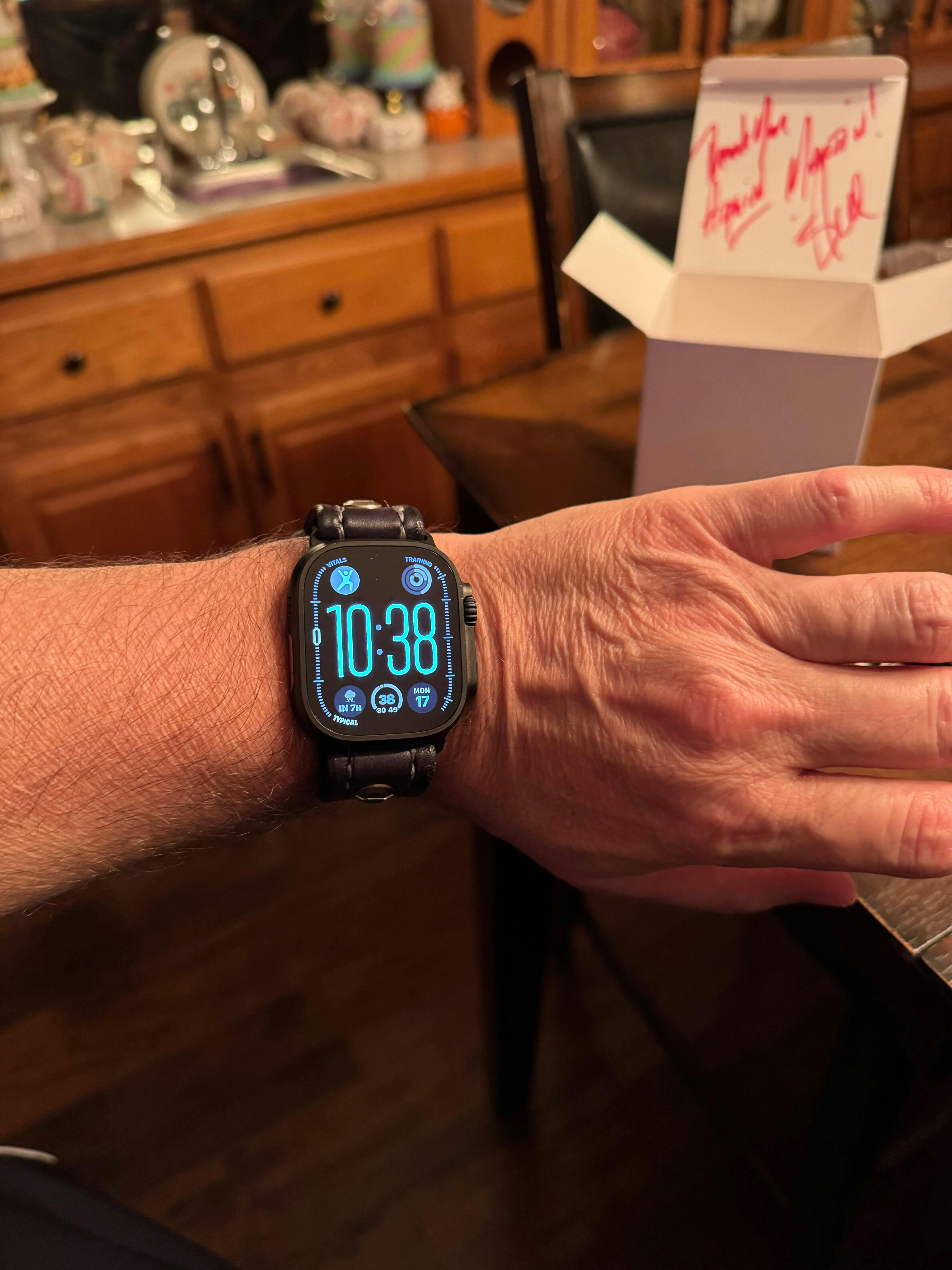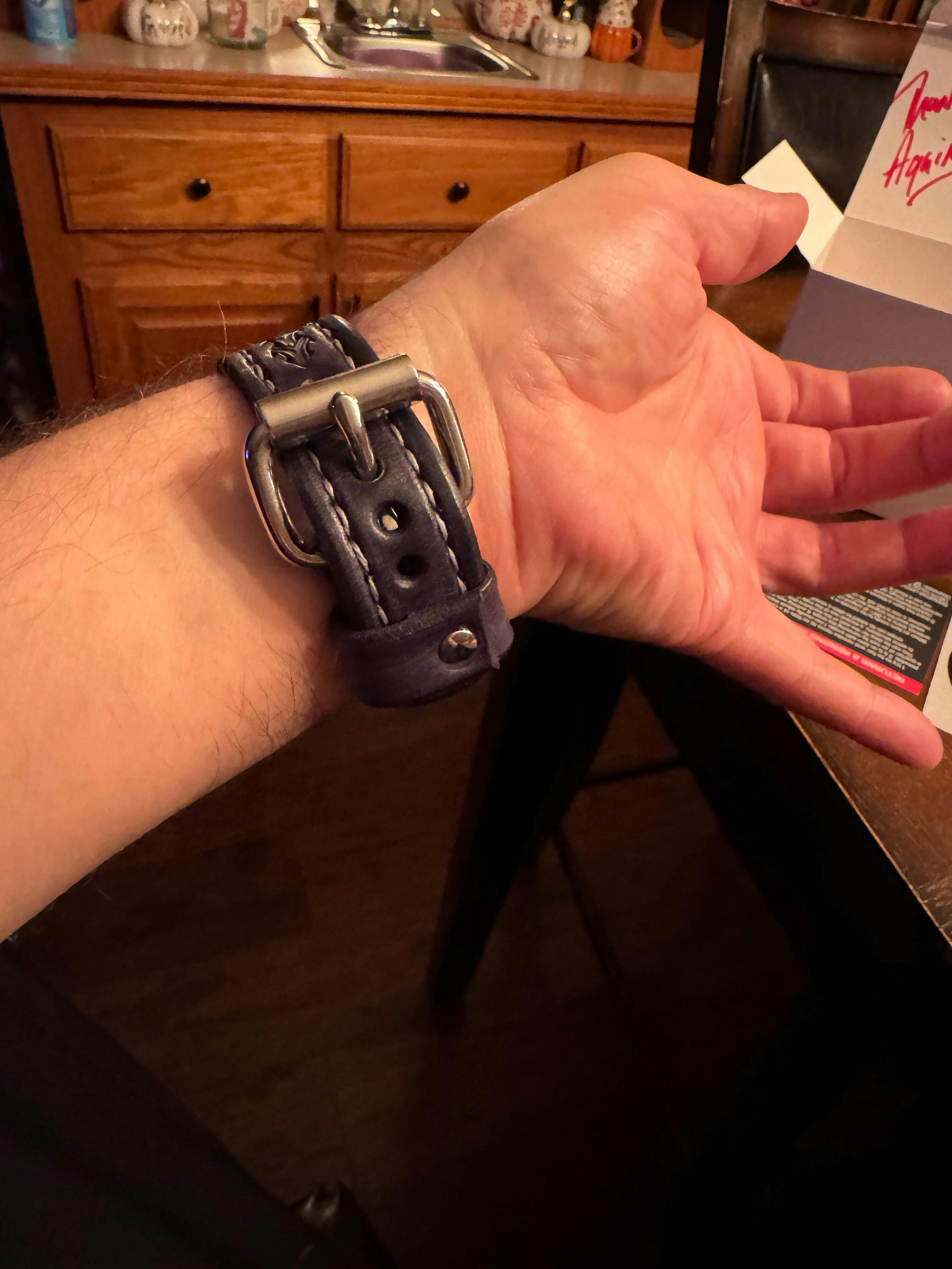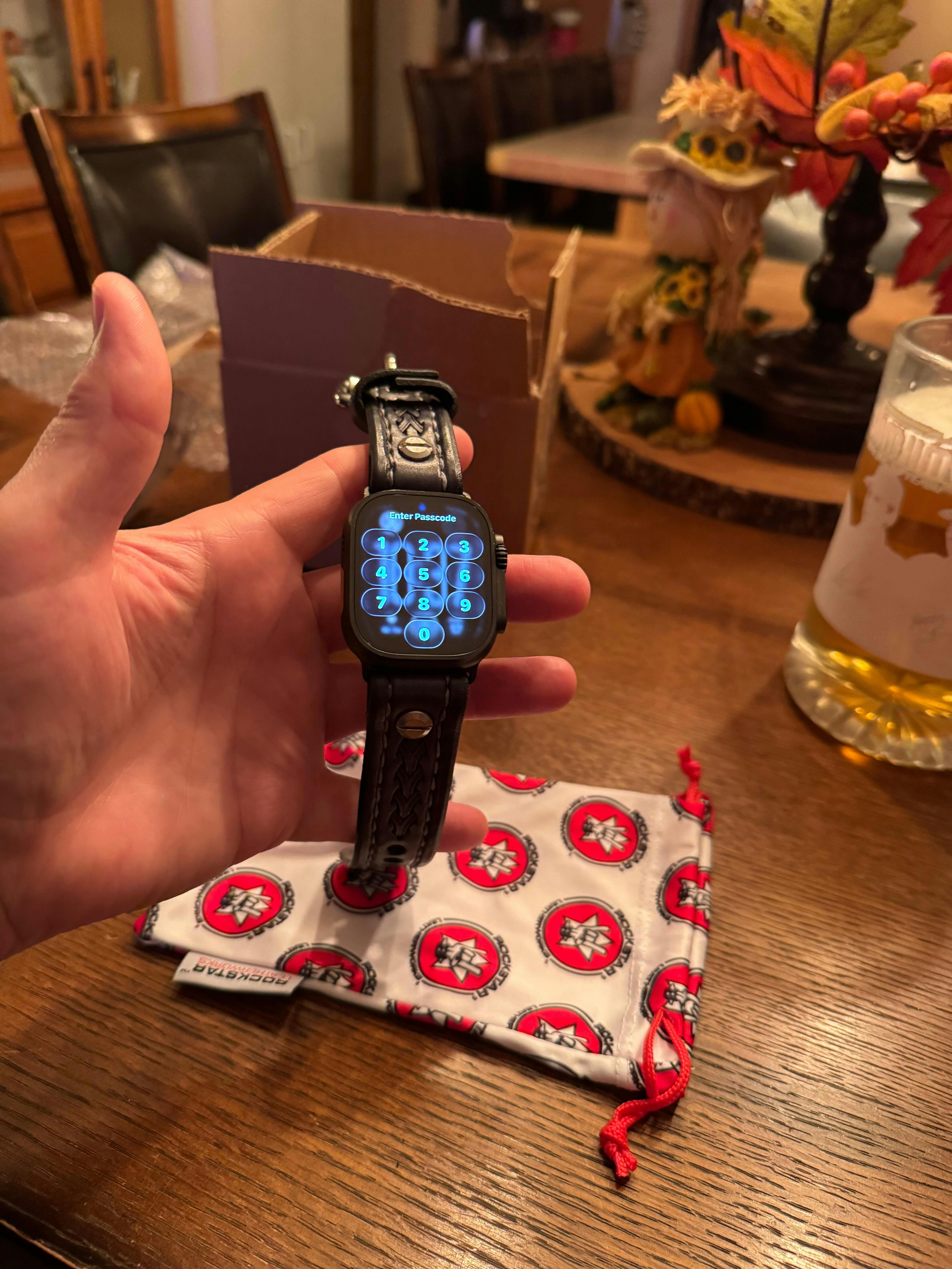 My Rockstar black leather cuff band for the Apple Watch Ultra just arrived, and it came in a beautiful package. It fits perfectly, the quality is top-tier, and the leather smells amazing! I keep lifting my wrist just to smell it — that rich, high-quality leather scent! In short… I f-ing LOVE my Rockstar leather watch cuff!